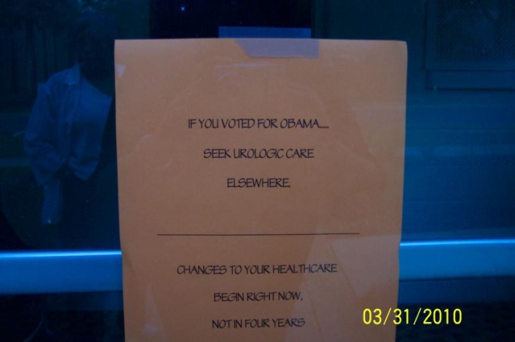 The sign reads: “If you voted for Obama … seek urologic care elsewhere. Changes to your healthcare begin right now, not in four years.”